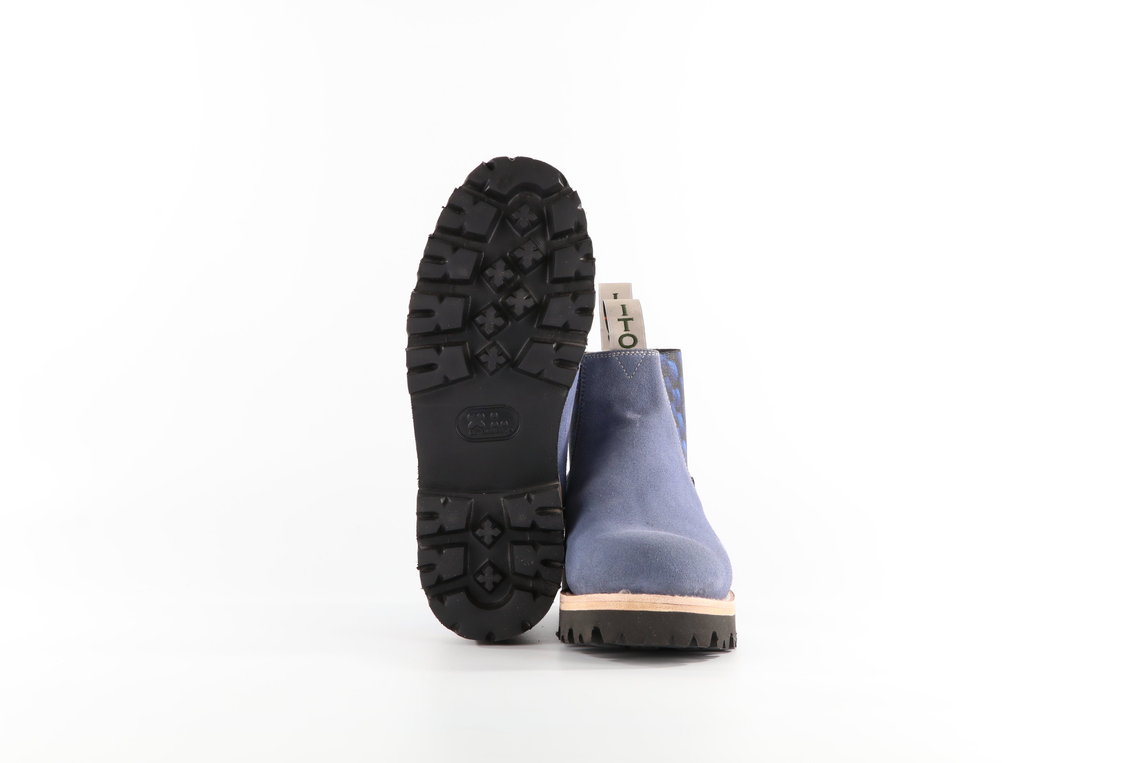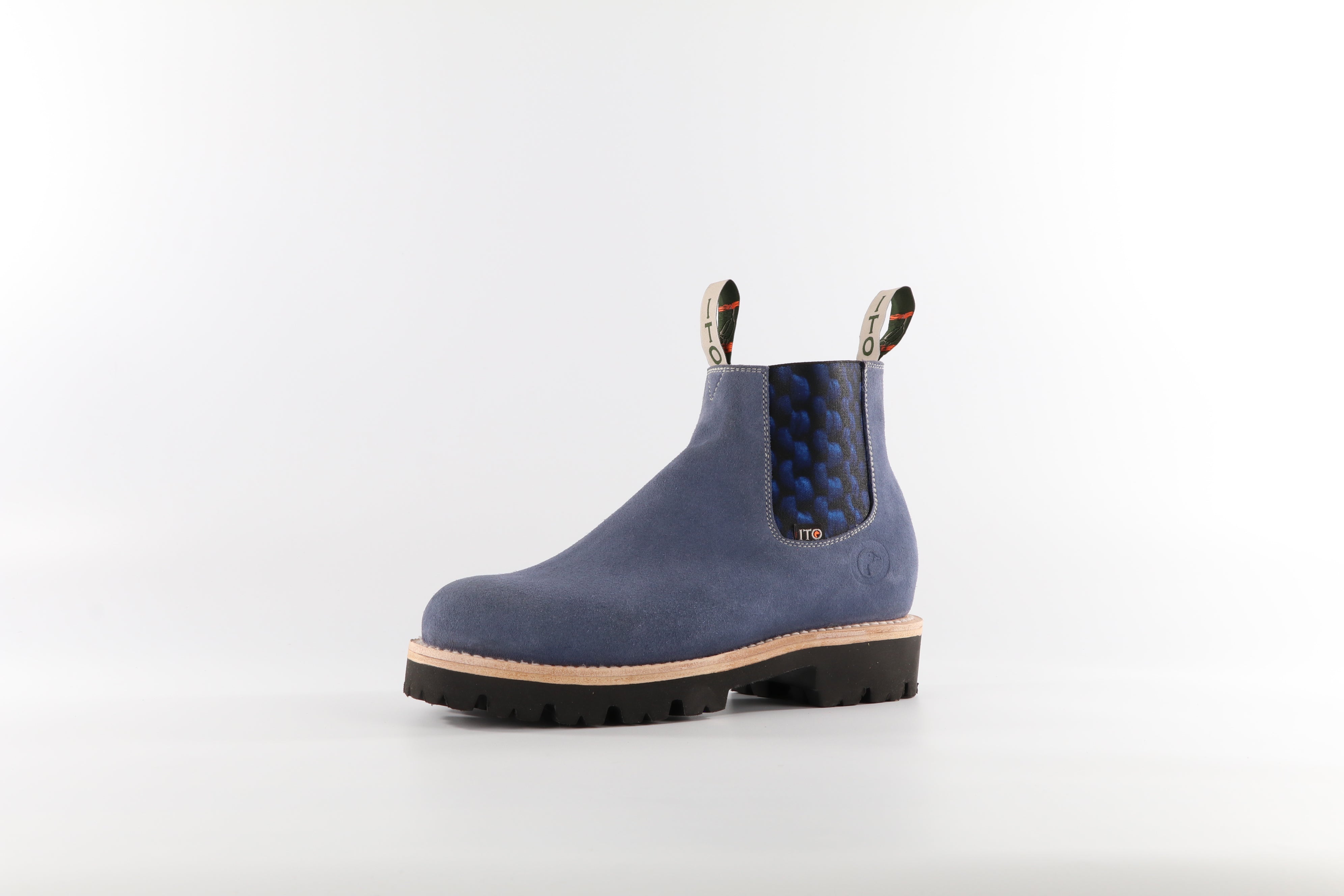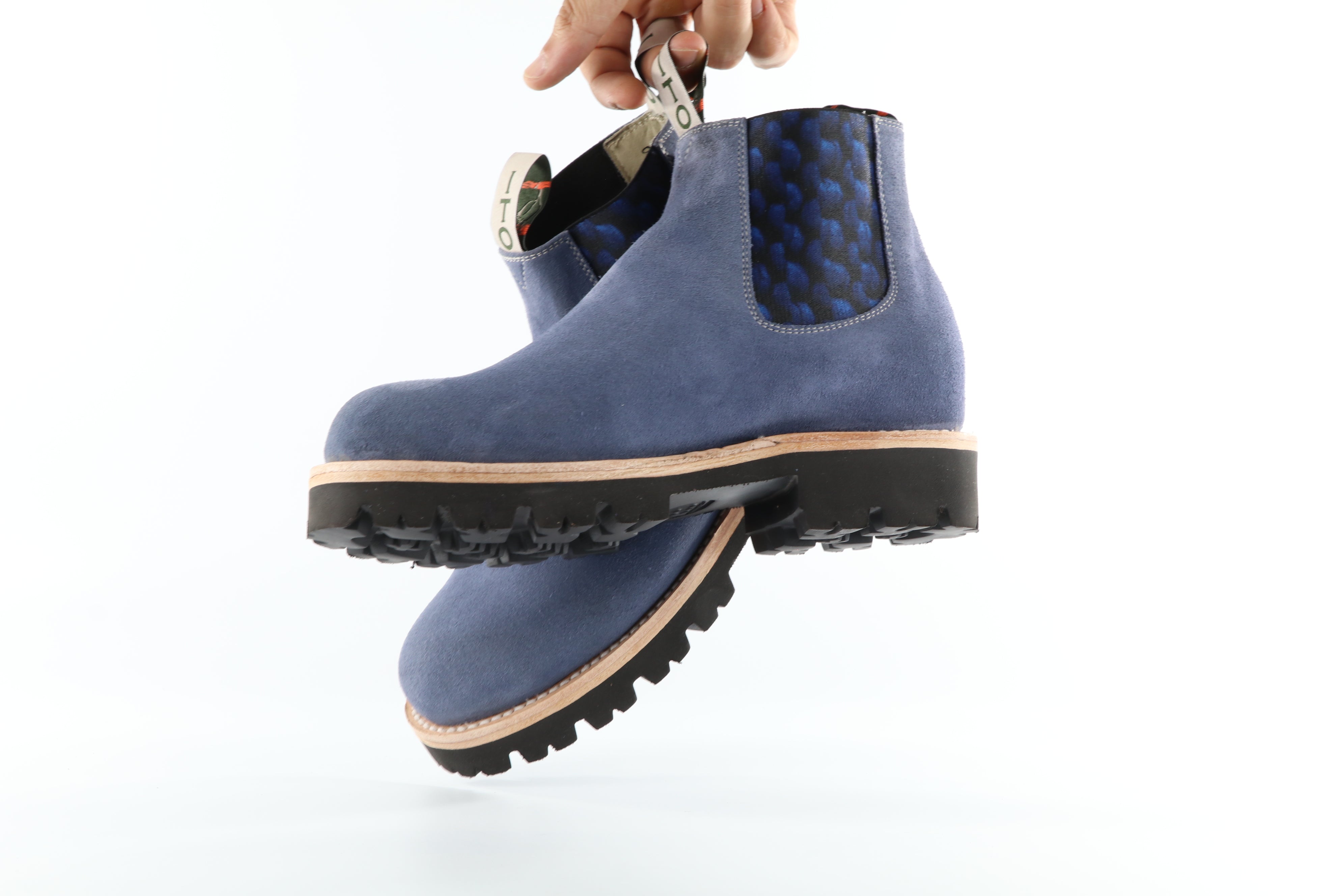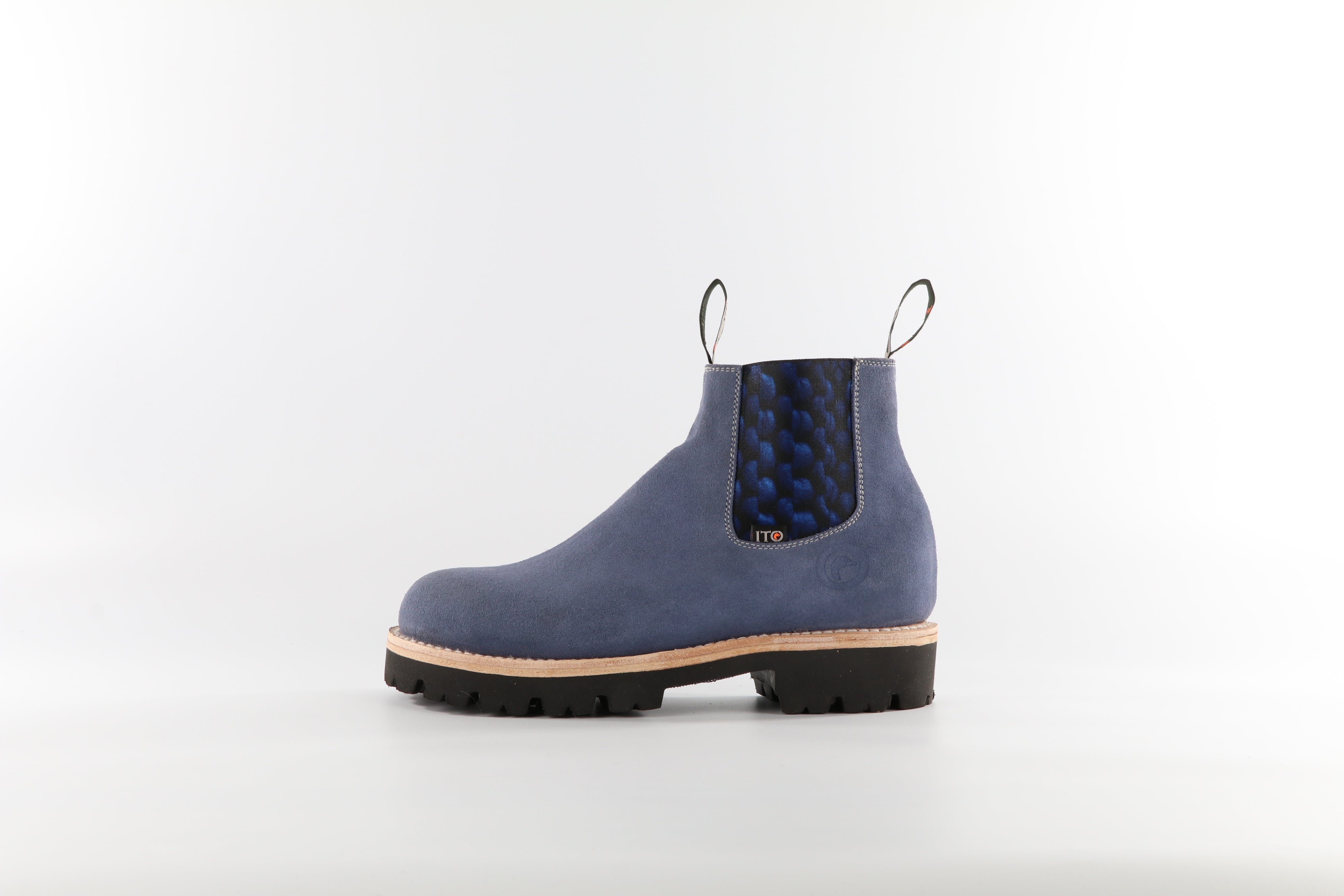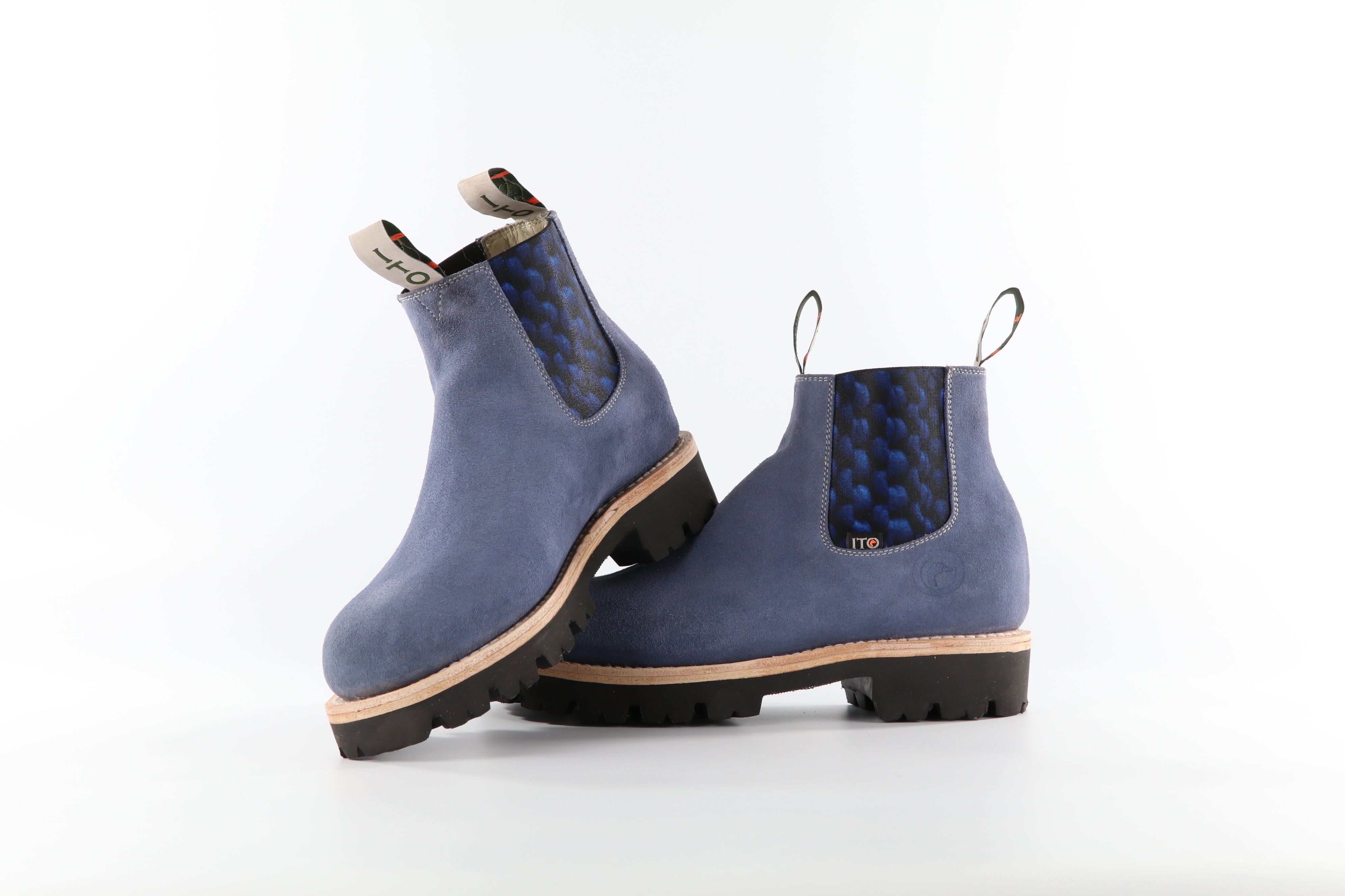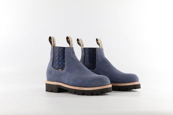 Suede Chelsea boots in deep blue with a bold textured elastic. Rugged yet stylish, designed for comfort and everyday versatility.