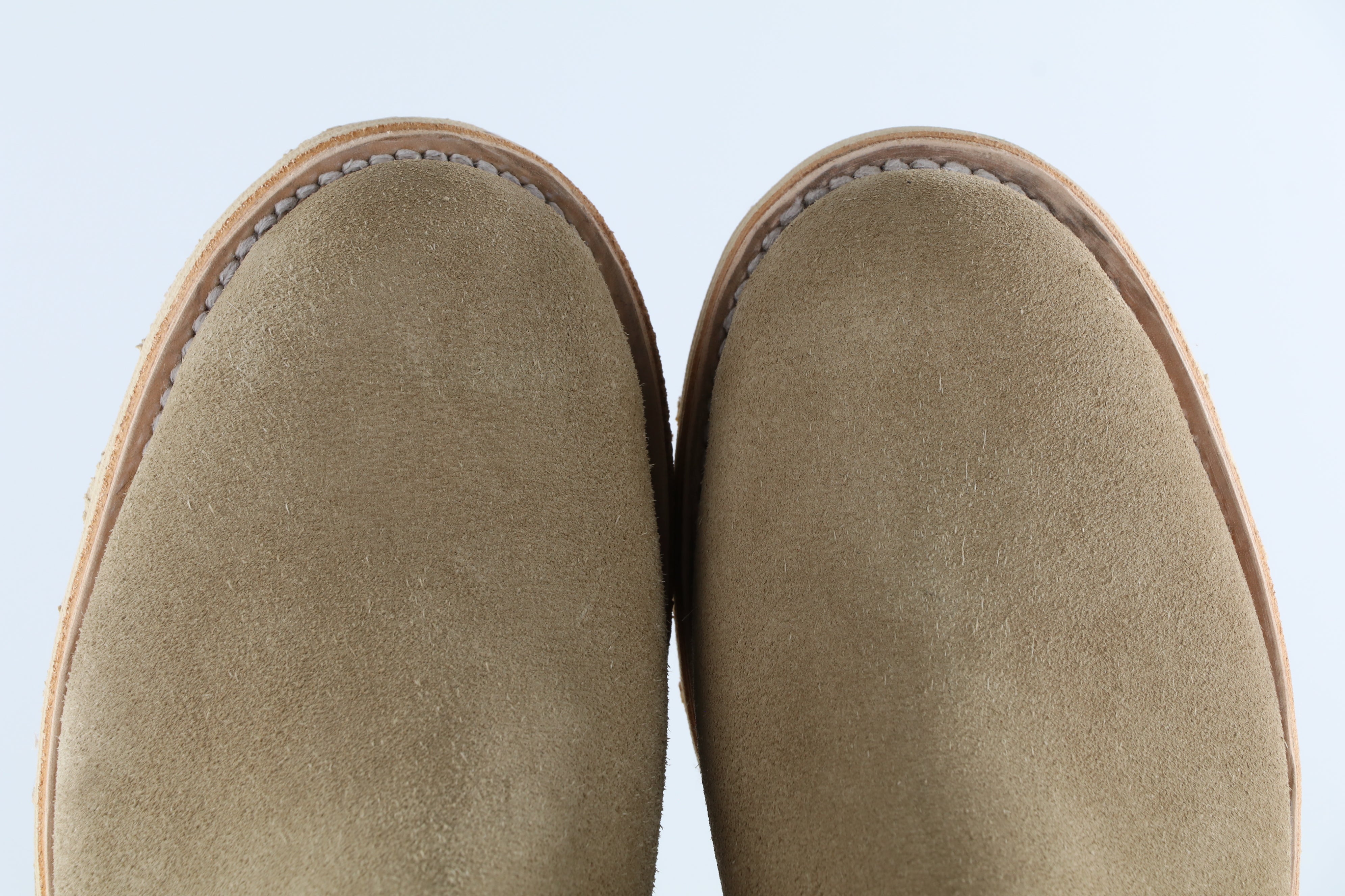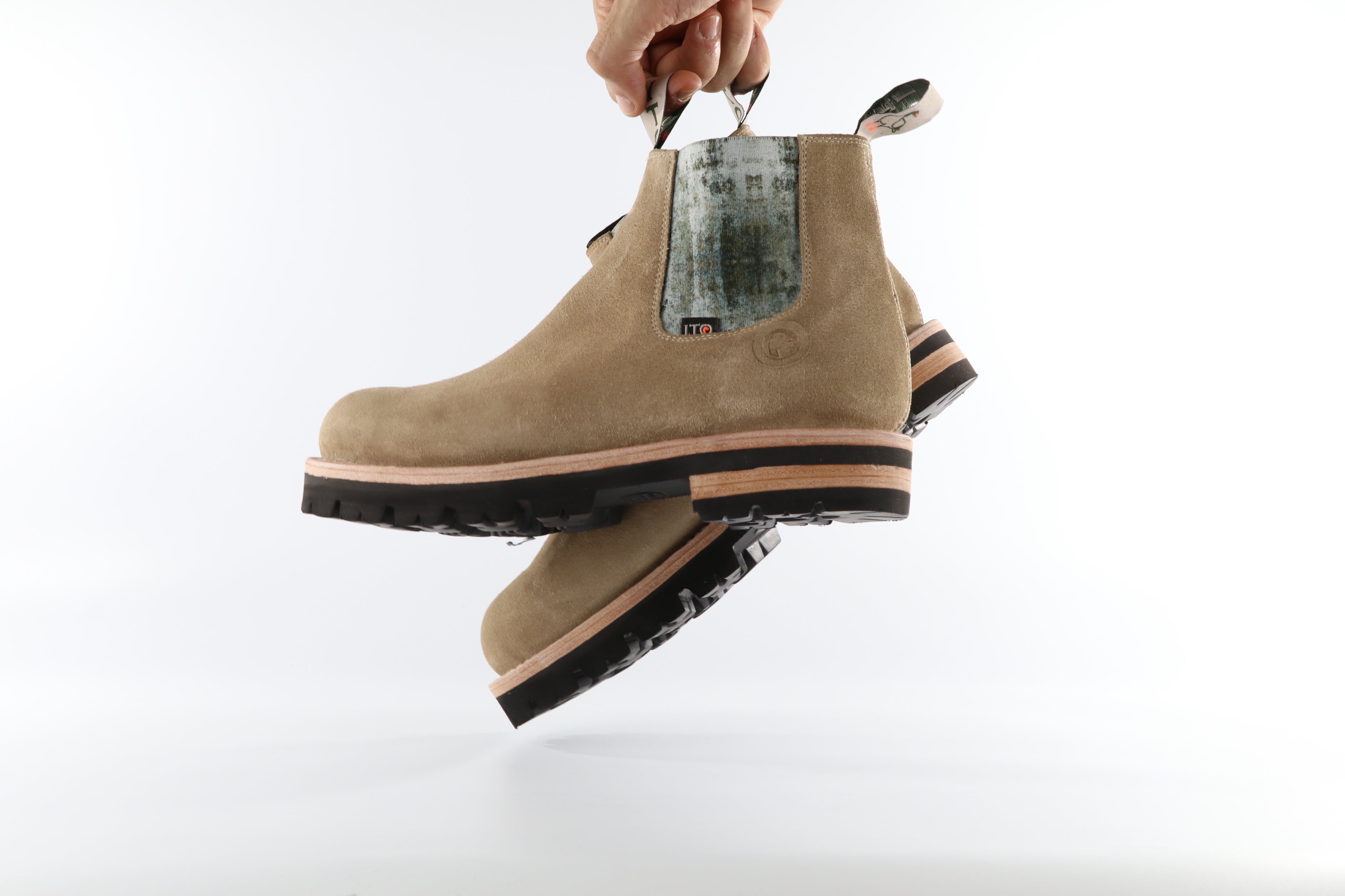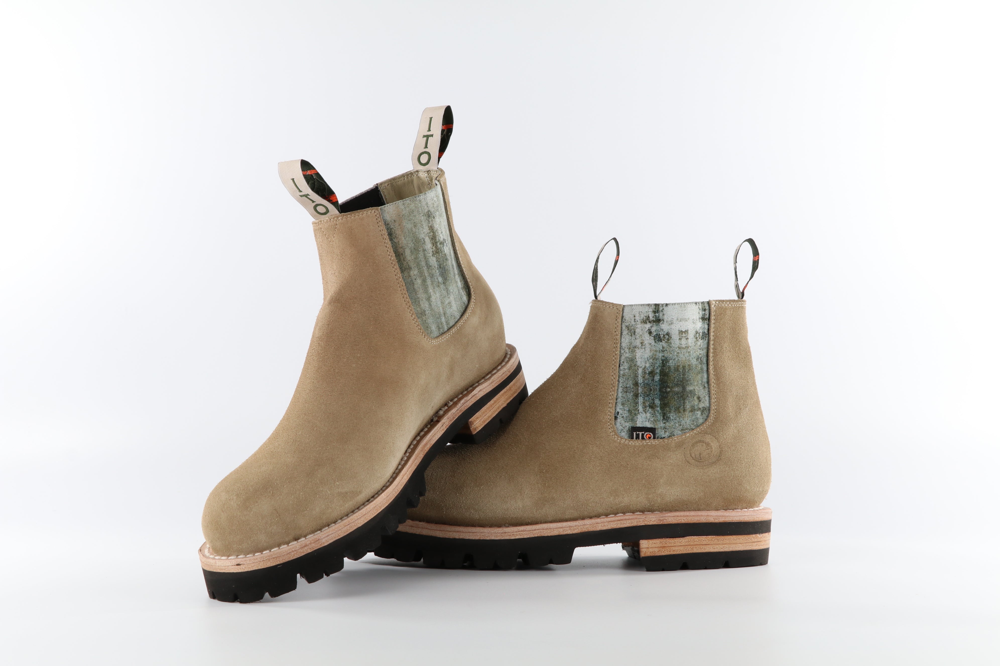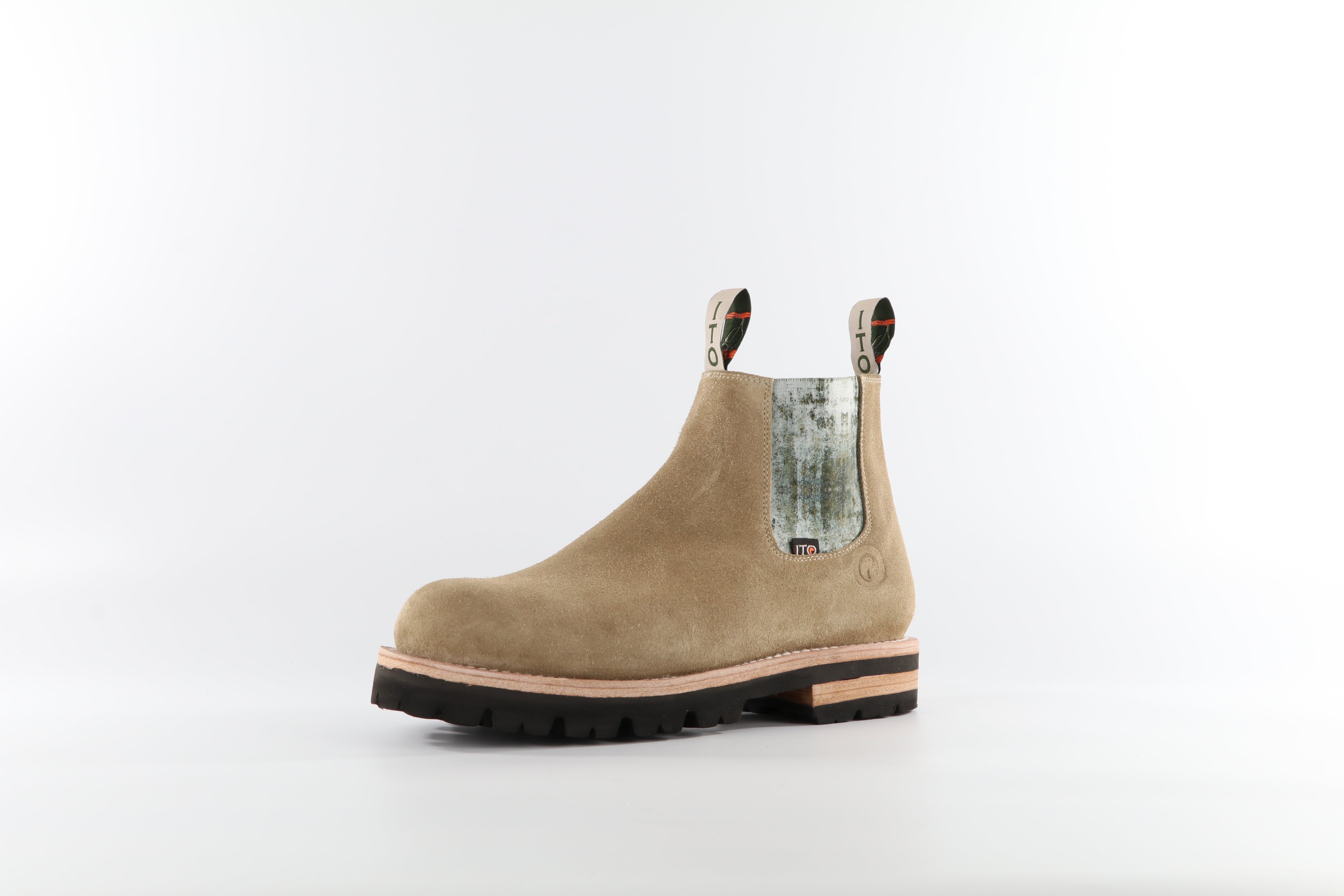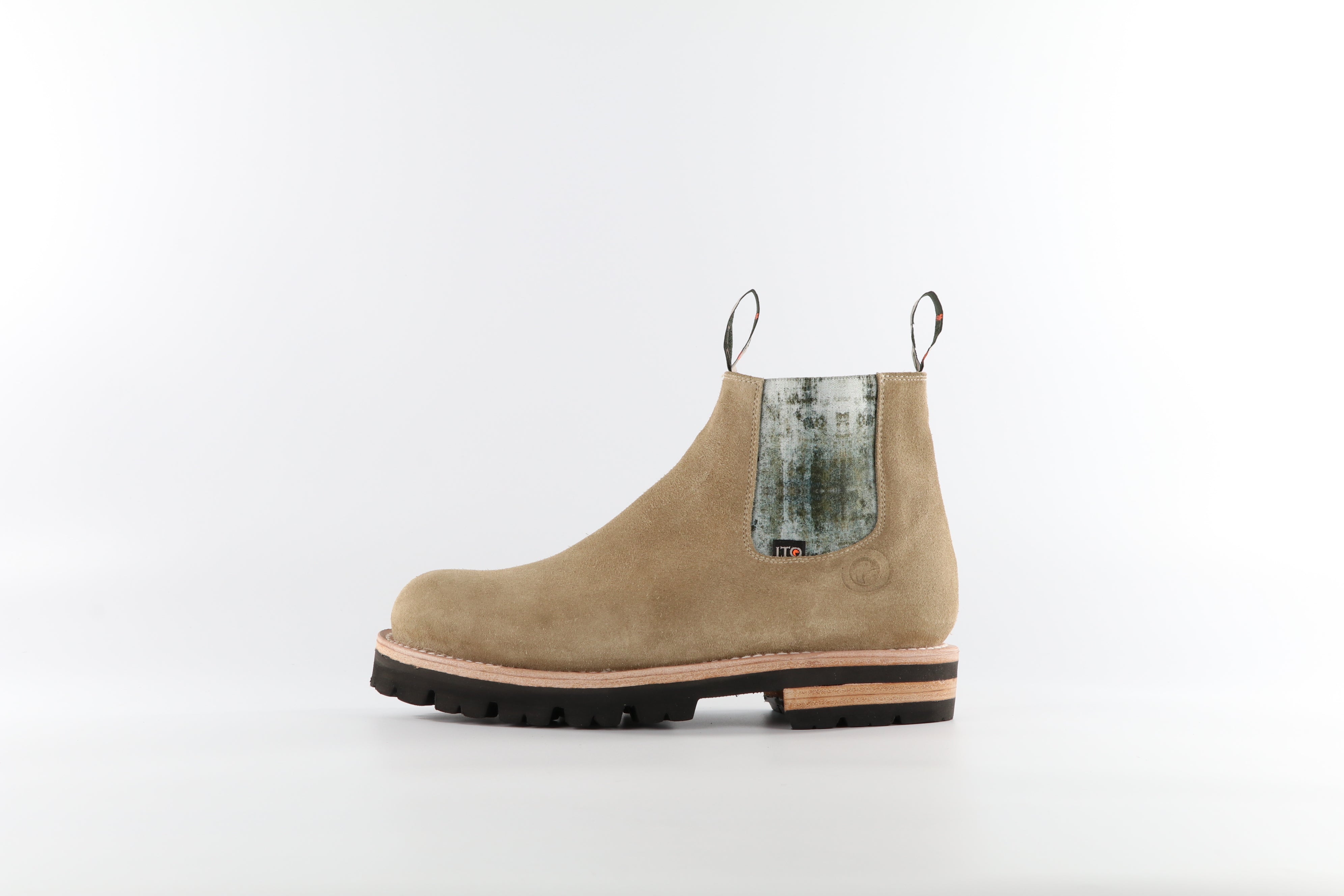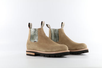 Suede Chelsea boots in warm sand tones, featuring a rugged sole and unique patterned elastic. Durable, versatile, and made for everyday style.