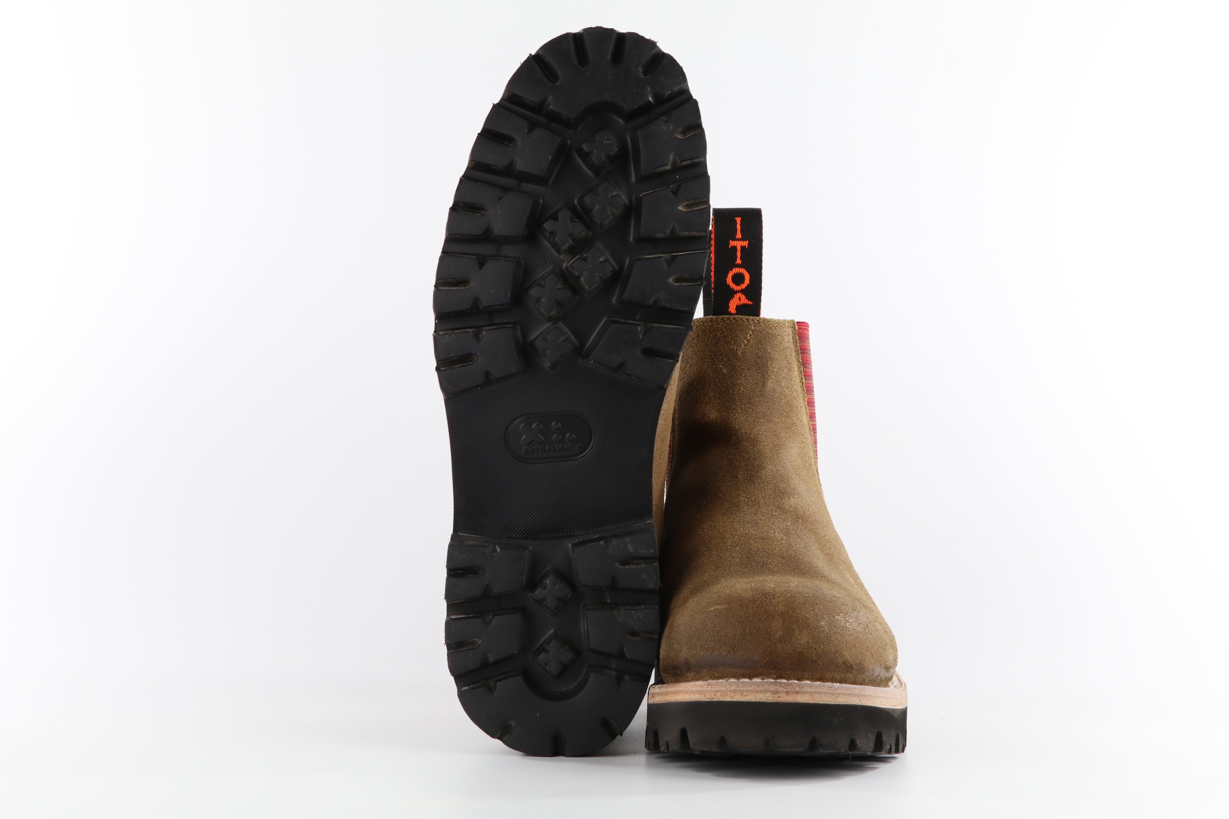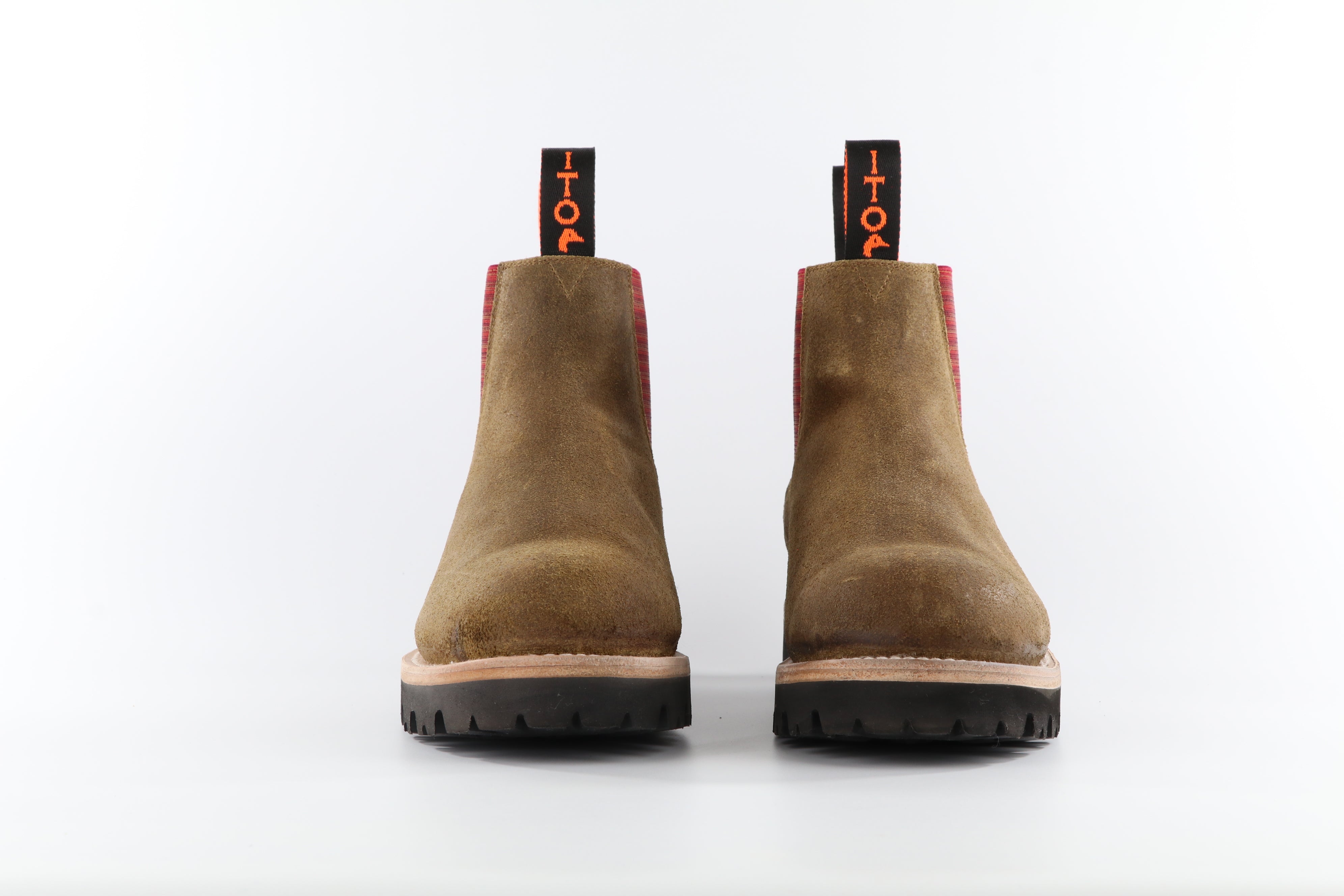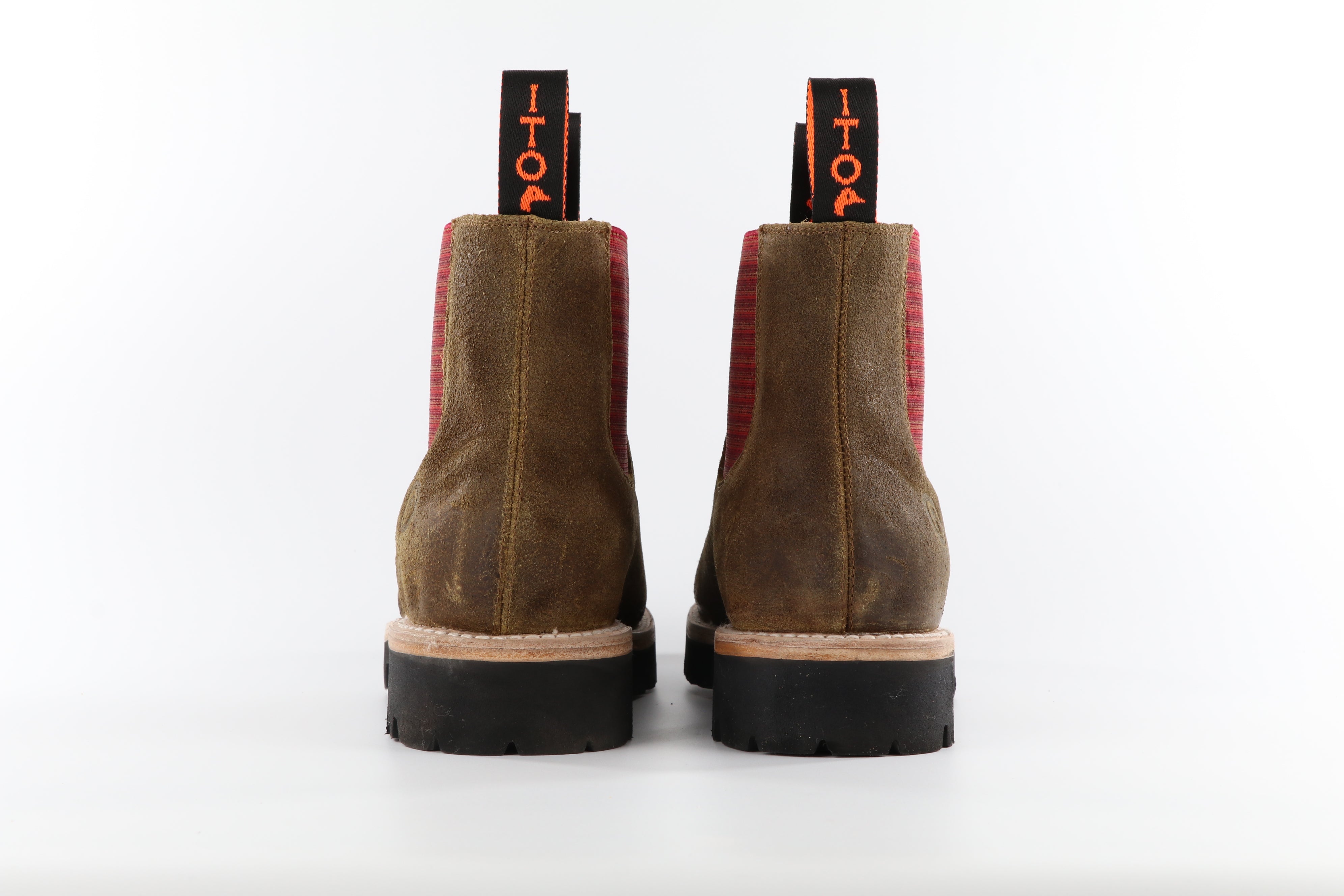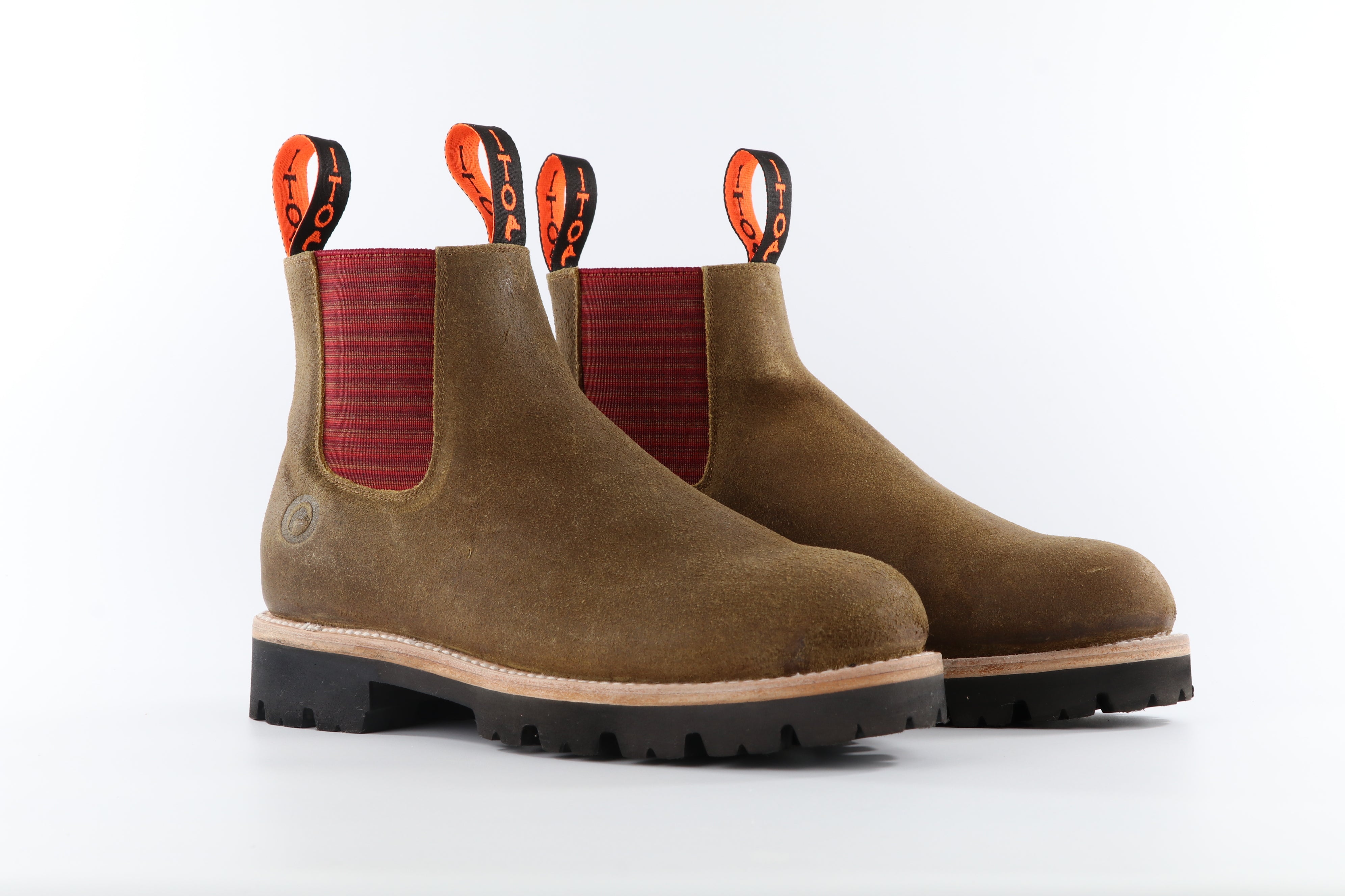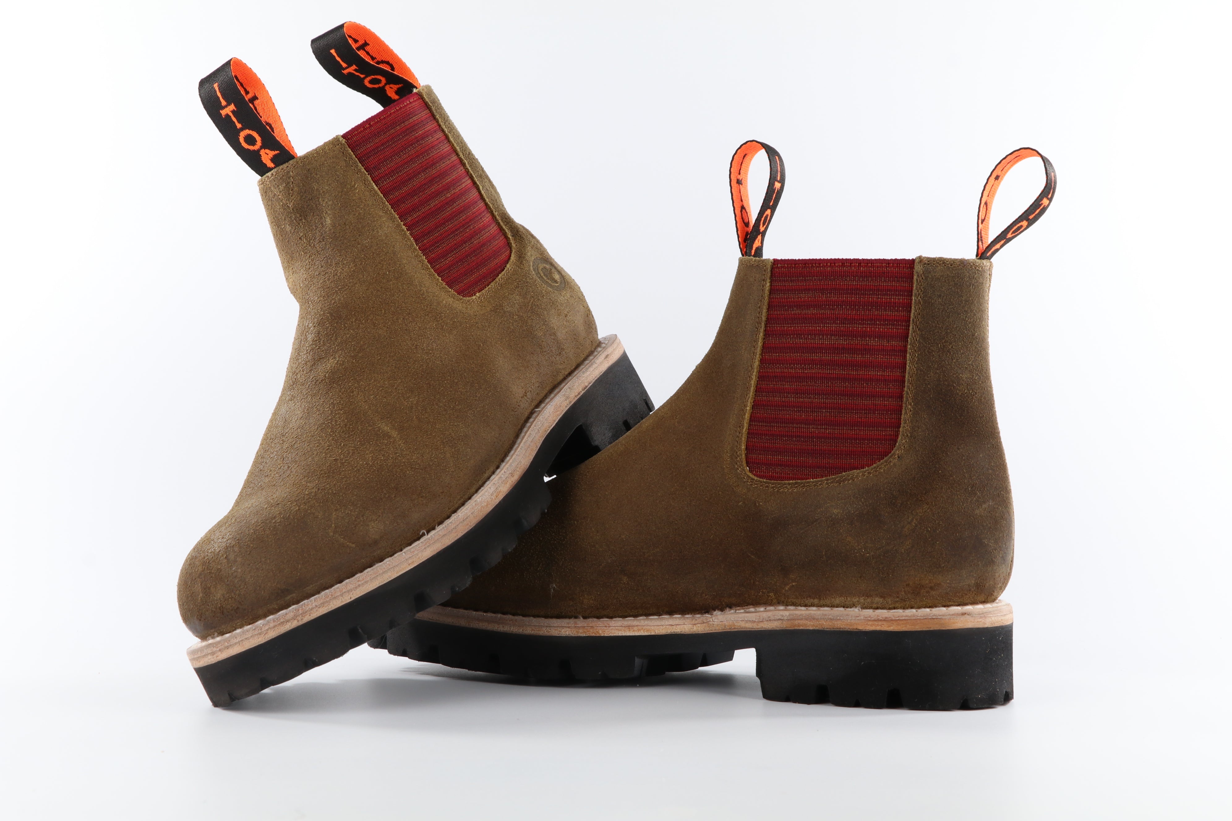 Handcrafted suede Chelsea boots in earthy tones with a bold red elastic. Durable, versatile, and designed for everyday comfort and timeless style.
